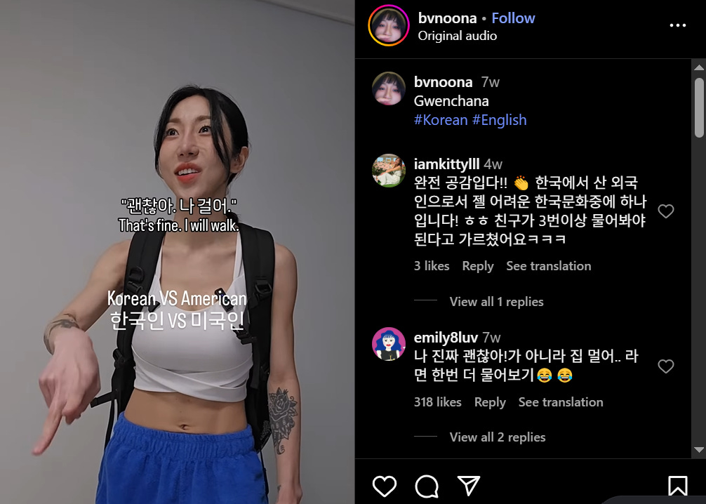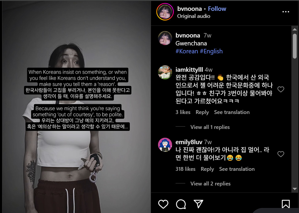 At the start of the reel, an American person asks an American person if they need a ride. The video then goes through various imagined conversations where a Korean is involved—an American asks a Korean, a Korean asks a Korean, and a Korean asks an American. In the latter scenario, the American declines the ride at first, saying she will walk, and the Korean person insists. The American declines again, and the Korean insists once more. The American gets agitated, and declines the ride again. The scenario ends with the Korean being fed up, and cutting to text blocks explaining how Koreans will assume someone is declining an offer out of courtesy unless a reason is stated. The reel’s purpose is to highlight the cultural differences in communication between Americans and Koreans.